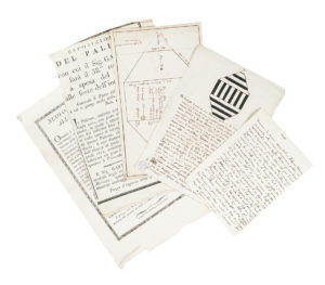 Documenti manoscritti e a stampa. Insieme anche alcuni disegni. Un timbro a inchiostro di antica proprietà. Dimensioni varie. (13) La raccolta comprende: 2 carte manoscritte (compilate recto e verso, non complete) che raccontano del globo aerostatico fatto volare dal conte Gian Francesco Barattieri nel suo giardini a Piacenza nel 1784 – Calcolo per formare un pallone volante di braccia tre di diametro. Manoscritto – Regola generale per formare un globo aerostatico di qualunque grandezza. Manoscritto – Peso del seguente globo (testo scritto al verso di un avviso teatrale del 1806) – 2 avvisi manoscritti nei quali si descrive il volo di Alfonso Baldacci e Ignazio Bronzini – 1 foglio a stampa dal titolo Dimensioni della nuova macchina – 1 disegno esplicativo delle dimensioni – 3 avvisi a stampa relativi ai palloni aerostatici - 2 disegni.
