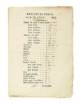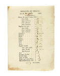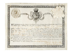 Pergamena stampata con note e firme manoscritte. Sigillo in carta conservato. Dimensioni: 200x267 mm. SI AGGIUNGONO: 2 carte contenenti i prezzi del Mercato di Pescia nel luglio del 1843. Testi a stampa e manoscritti. (3) II DOCUMENTO: Le carte contengono i prezzi in lire (differenti nell'arco di pochi giorni) del grano da seme al sacco, granoturco, miglio, saggina, fave, avena, fagioli, vecce, ceci, castagne, farina dolce, seme di lino, patate, olio al barile ecc.