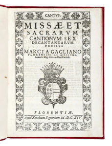 1 volume in 4° (230x170 mm). Conservato il libro parte del Cantus. Pagine 24. Al verso del frontespizio la dedicatoria al Serenissimo Cosmo / Magno Etruriae Duci / [...]. Florentiae Die 26 Aprilis 1614. Index in fine (p. 24). Capilettera incisi. Carte molto ben conservate. Ex Libris Bruno Lusini. Legatura in pelle rossa moderna con filetti in oro, che riproduce le armi della famiglia Medici. (1) Contiene: Veni Sancte Spiritus – Sicut Cedrus – O vos omnes – Ave Maria – Clamemus – Duo Seraphin – Popule meus – Quo raperis – Ecce quam bonum – Puer qui natus est – Regina coeli – Adoramus te Christe – Ne Timeas Maria – Hodie – Faustinus – Kyrie – Goria in excelisi Deo – Credo – Sanctus Agnus Dei. Marco da Gagliano (1582-1643), una delle personalità di primo piano della Firenze di inizio '600, autore di melodrammi, divenne Maestro di Cappella alla corte dei Medici. Fu tra i fondatori dell'Accademia degli Elevati, insieme a Ottavio Rinuccini e Jacopo Peri, con i quali spesso collaborò per la composizioni di balli e mascherate per da eseguirsi durante i periodi di carnevale alla corte dei Medici.