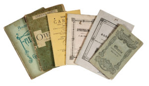 Documenti a stampa. Con i nomi degli interpreti. Brossure originali. I libretti di Otello e Falstaff con alcuni segni del tempo. Dimensioni varie. (5) Si tratta di: Oberto conte di San Bonifacio (Prima rappresentazione: Milano, La Scala 1839. Milano, Truffi 1839) – Alzira (Prima rappresentazione: Napoli, Teatro S. Carlo. Napoli, Tipografia Flautina 1845) – Stiffelio (Teatro La Fenice 1851-52. Milano, Ricordi. Libretto della prima rappresentazione al Teatro La Fenice. Il testo è quello della prima versione, anche se presenta interventi della censura) – Don Carlo (Roma, Teatro Apollo, Carnevale 1867-68. Si tratta della prima rappresentazione romana dell'opera, con alcuni interventi della censura papale. Tra gli interpreti Teresa Stolz) – Otello (Prima rappresentazione: Milano, Teatro alla Scala 1886-1887) – Falstaff (Prima rappresentazione: Milano Teatro alla Scala 1892-93).