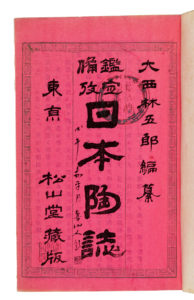 Saggio sulla ceramica giapponese. Tokyo, 1919 (8 era Taisho), per l’editrice Matsuyama-do Shoten (editore Rihachi Fujii), la tipografia Onishi Ringoro. Tipografo: Kumao Onishi.