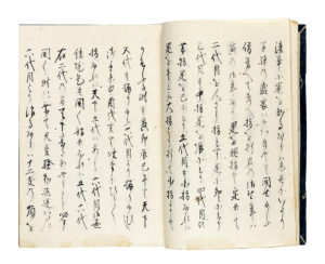 9 volumi in-4°. Manoscritto nipponico misurante al foglio di mm 235x170 con specchio di scrittura irregolare; testo ripartito in 18 capitoli complessivi ed edito in 9 volumi vergati a pennello in calligrafia corsiva su carta giapponese distribuito su 9 colonne a facciata (in media). Numeri di pagine a singolo volume: I (Capp.1-2): 78 [2+74+2]; II (Capp. 3-4): 72 [2+68+2]; III (Capp. 5-6): 76 [2+72+2]; IV (Capp. 7-8): 86 [2+82+2]; V (Capp. 9-10): 84 [2+80+2]; VI (Capp. 11-12-13): 86 [2+82+2]; VII (Capp. 14-15): 72 [2+68+2]; VIII (Capp. 16-17): 90 [2+86+2]; Vol. 9 (Cap. 18): 58 [2+54+2]. Sulla scorta dell'analisi calligrafica e di un raffronto tra le varie versioni reperibili presso l'Istituto Nazionale di Letteratura Giapponese, questa copia pare risalire alla tarda dell'era Edo o al principio dell'era Meiji, ossia fra la metà e il terzo quarto del XIX secolo. Condizione di conservazione molto buone; l'opera risulta interamente leggibile. Ciascun volume mantiene la copertina con l'etichetta del titolo, compreso del numero dei capitoli. Le copertine e alcuni fogli presentano piccole macchie, alcuni segni di tarlo e segni minimi di usura. Rilegatura di stile giapponese seriore, in buono stato. (9) Sussistono numerose copie di questo romanzo, trascritte da vari autori nel corso degli anni. Sebbene l'identità dell'autore originario resti ignota, una delle teorie più accreditate ritiene che si trattasse di una spia inviata a Banshu durante il cosiddetto incidente di Ako Roshi. Il Gokoku Onna Taiheiki è in sostanza un romanzo storico scritto a metà del periodo Edo (primo quarto del XVIII secolo) e basato sull'incidente di Yanagisawa: la storia ruota attorno a Nobuko Takatsukasa, moglie di Yoshiyasu Yanagisawa, a sua volta stretto collaboratore del quinto shogun Tsunayoshi Tokugawa. Costei uccise il marito per sventare un complotto che avrebbe fatto diventare il figlio Yoshizato il nuovo shogun, per poi suicidarsi. I nomi dei personaggi echeggiano figure storiche realmente esistite, ma trattandosi di una vicenda narrata sulla base di fatti storici soltanto parzialmente confermati, l'opera ha guadagnato popolarità soprattutto come romanzo di intrattenimento.