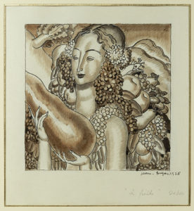 DUPAS Jean (1882-1964) Les Fruits Technique mixte au fusain, encre de Chine et aquarelle, sgnée en bas à droite Jean Dupas, datée 1928 accompagnée de la mention «Étude pour Saks». 26 x 23,5 cm à vue
