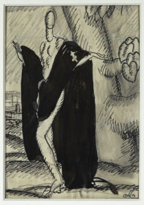 DUPAS Jean (1882-1964) Silhouette au drapé noir Dessin à l'encre et fusain contrecollé, monogrammé en bas à droite. 13,5 x 9 cm