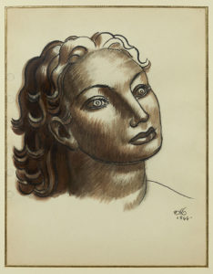 DUPAS Jean (1882-1964) Tête allégorique Dessin beige à l'encre de Chine et au fusain , monogrammé en bas à droite et daté 1944. 24 x 18,5 cm à vue