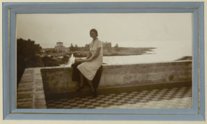 LARTIGUE Jacques-Henri (1894-1986) Renée Perle sur la terrasse Tirage argentique d'époque. 7 x 13,5 cm (À vue, sous encadrement)