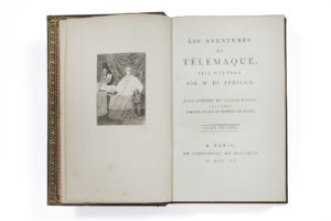encadrement droit sur les plats avec petite chaînette au centre, dos à 5 doubles nerfs ornés de filets et roulettes dorés et d'un f leuron à mille points répété, encadrement intérieur du même maroquin avec roulette dorée, doublure et gardes de tabis rouge ornées d'une roulette, tranches dorées (Simier). Exemplaire dans lequel on a remplacé le frontispice et les 6 figures de Cochin par la suite éditée des 24 (sur 25) figures de Moreau et contenant le portrait de Delvaux que Renouard fit exécuter quelque temps après. On a, en outre, ajouté 4 portraits de Fénelon. (Quelques rares rousseurs) PROVENANCE: Mortimer L. Schiff (I, 1938, n° 169) et Abdy (1975, n° 116).