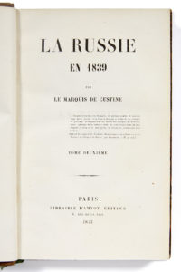 CUSTINE Marquis de La Russie en 1839. Paris, d'Amyot, 1843. 4 volumes in-8 , édition originale, composée de 36 lettres suivies d'un résumé du voyage en Russie entrepris par le marquis de CUSTINE. Demi-veau fauve de l'époque, dos lisses...