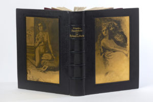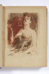 ornements typographiques dessinés et gravés par Louis Jou. Reliure en maroquin bleu nuit (de Noulhac), cuivres signés de Lobel-Riche encastrés au centre des plats dans un encadrement de filets à froid, dos à nerfs orné avec lettre or, double filet doré sur les coupes, encadrement intérieur de maroquin bleu nuit orné de filets dorés, doublure et gardes de tabis violet, doubles gardes de papier nuagé, tranches dorées, couverture imprimée et dos conservés, (petites usures aux coins et sur les coupes). Tirage à 352 exemplaires auxquels s'ajoutent 10 suites des eauxfortes sur vélin d'Arches. Exemplaire n° 1 (non numéroté), exemplaire unique sur Japon ancien à la forme, contenant 4 états de chacune des illustrations: un état en noir avec remarques sur peau de vélin, un état en noir sur japon avec remarques, un état en couleurs sur japon avec remarques et l'état terminé; ainsi qu'un dessin original. Il est en outre enrichi de 4 DESSINS ORIGINAUX DE LOBEL-RICHE, SIGNÉS; d'une LETTRE AUTOGRAPHE DE L'ÉDITEUR et d'une SUITE DES 4 PLANCHES REFUSÉES, dont deux en deux états. Les quatre dessins, études pour quatre des poèmes, sont reliés en tête du volume : Le Gâteau (sanguine) ; Un Hémisphère dans une chevelure (fusain et sanguine) ; L'Invitation au voyage (fusain) ; Le Thyrse (encre et fusain). On trouve, montée sur l'un des premiers feuillets blancs, une lettre tapuscrite de l'éditeur à M. Léon Orosdi lui offrant son propre exemplaire. Bien complet du prospectus relié à la fin. TRÈS BEL EXEMPLAIRE.