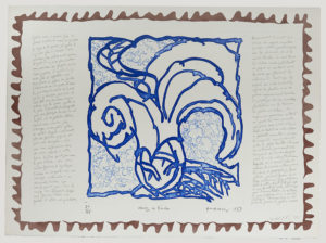 Rhizome, Sphinx en chapeau, De toutes parts, Papier de mur et Le Chien Roi, titrées, numérotées et signées par l'artiste, exemplaires n°30/75 ; six de ces eaux-fortes comportent un long manuscrit original autographe dans les marges, à la mine de plomb, écrit et signé par Michel Butor, daté 1985. 56 x 76 cm chaque