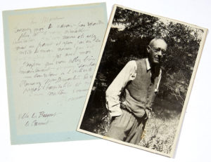 BONNARD Pierre (1867-1947). L.A.S. «PBonnard», Villa le Bosquet, Le Cannet, à M. Dumoulin ; 1 page in-8 (encre un peu passée). Il n'a pu répondre à son invitation et remercie de lui avoir proposé l'hospitalité. On joint une...
