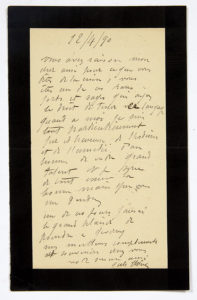 CHÉRET Jules (1836-1932). L.A.S. «Jules Chéret», 12 avril 1890, à Claude MONET ; 1 page in8 (deuil). Lettre à Claude Monet. «Vous avez raison mon cher ami pour ce que vous dites de la croix, vous êtes un de ces rares forts et...
