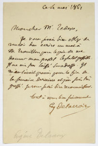 DELACROIX Eugène (1798-1863). L.A.S. «Eug. Delacroix», 4 mai 1861, à M. TEDESCO ; 1 page in-8. Il prie le marchand d'écrire à M. Trouillon «pour le prier de me donner mon pastel le plutôt possible. Il ne m'a pas laissé son...
