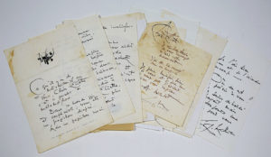 Moult de parte et sa vignette (découpe avec trace de collage à une lettre, une lettre réparée au scotch). Belle correspondance amicale et littéraire. Son amie Éliette écrit et cherche à se faire publier. Mathieu lui apporte tout son soutien et l'encourage à persévérer. Le mystère de cette jeune correspondante, qu'il n'a pas encore rencontrée, l'intrigue et l'éblouit : «Ce qu'il y a de merveilleux en vous [...] c'est ce pouvoir de métamorphose. Dans ce monde gris et conformiste, vous êtes un papillon diapré. Mais un papillon muni d'une âme aussi fragile que ses ailes». Il l'imagine «comme une bergère extraite d'un roman d'Urfé et jetée dans un univers de barbares, comme une princesse de Watteau arrachée à sa clairière»... Il lui renvoie son manuscrit et fait des voeux pour que l'éditeur suisse la publie... Il la console : «Ne soyez pas si triste si les éditeurs sont méchants. L'essentiel n'est-il pas de dire et d'exprimer ?»... Cette correspondance le charme : «Chacune de vos lettres m'étonne et votre mystère grandit. À la première lettre j'ai cru que vous aviez douze ans [...] je n'arrive pas à croire que vous avez pu conserver une âme si fraiche». Il a écrit un petit livre «dans lequel je m'étonne que tout ce qui est vrai et naturel apparaît de nos jours comme affecté et ridicule»... Il la remercie de toutes ses délicates attentions, est très occupé, mais espère la voir bientôt à Paris : «J'ai beaucoup aimé votre parodie de Gide et je vous prie de croire qu'en dépit de mes silences je suis infiniment attentif à chacun de vos gestes, à chacune de vos pensées et que j'attends avec grande impatience la joie de vous connaître»... Il s'étonne qu'elle soit mariée : «Vous me semblez si pure, si nouvelle au monde». Il lui demande quels sont ses poètes favoris, si elle connaît Henri MICHAUX... Il s'inquiète de sa santé et lui renvoie ses poèmes dont il a apprécié «la fraicheur et cet accent si particulier qui est le tien. Quel dommage de ne pas les publier»... Il la remercie de l'envoi d'un livre sur Michaux : «Je l'ai bien connu et je l'aimais beaucoup»... Etc.