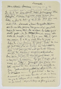 enfin, tu écris comme tu peux mais tu sais ça fait bien plaisir d'avoir un mot tous les jours. C'est parce que tu n'as pas envie d'écrire sans cela tu trouverais le moyen. Tanger n'est pas plus varié qu'Issy [...] Moi en ce moment je suis encore couché il est 10 heures car j'ai la collique et le ventre par cela même un peu démoli. Et puis le temps a changé ce matin et je ne pourrai probablement pas travailler aujourd'hui à mes tableaux. J'aurai probablement terminé le paysage de MOROSOFF - fait de ma fenêtre - et entamé celui de la Casbah. Je vois les nuages se disparaître et je vais me mettre tout de même en route, si je ne peins pas je dessinerai. Je te dirai que je suis assez en route avec calme et que je fais 2 séances par jour - matin et après-midi. Si le temps est pour moi je m'en réjouirai dans 1 mois - si ça continue, j'aurai fait du travail»...