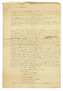 Unique. Il a de nombreuses toiles en cours, non terminées, et dans 2 ans peut-être Ambroise VOLLARD pourra-t-il, «après une exposition particulière vous prêter mes peintures»... Il a également en cours d'exécution des albums d'eaux-fortes «avec petites légendes et poèmes de moi»... Il se souvient de «vos vitraux de l'École de Pharmacie et du temps lointain où j'ai tracé les plombs sur les cartons et renversé par surcroit une bouteille d'encre» ; il était alors chez M. Hirsch ; «vous m'avez offert d'exécuter les vitraux d'après vos cartons, après avoir vu mes dessins vous m'avez encouragé, mais j'étais un sauvage (je le suis un peu resté)». Il a gardé «un souvenir reconnaissant et cordial de ce que vous avez voulu faire pour moi voilà plus de trente ans». Par discrétion, il ne l'a plus jamais recontacté ; il a ainsi occupé l'atelier en face de celui de RENOIR, auquel il n'osa jamais adresser la parole... Il insère quelques vers dans sa lettre... Il ajoute qu'il avait «d'abord refusé de faire partie de ce jury», répugnant au rôle de justicier ou de juge, mais comme il est toujours possible de voter blanc, il s'est ravisé...