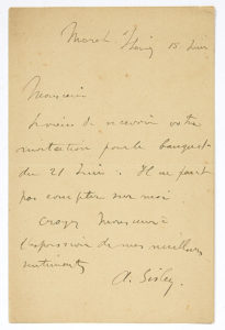 SISLEY Alfred (1839-1899). L.A.S. «A. Sisley», Moret s/Loing 15 juin ; 1 page in-8. Il vient de recevoir l'invitation pour le banquet du 21 juin [de la Société Nationale des Beaux-Arts] : «Il ne faut pas compter sur moi»...