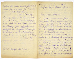 GOUNOD Charles (1818-1893). L.A.S. «Ch. Gounod», Londres 24 janvier 1874, au marquis de CAUX ; 4 pages in-8. Le Figaro annonce la représentation de Mireille le 2 février, au Théâtre de Saint-Pétersbourg, et Gounod s'indigne :...