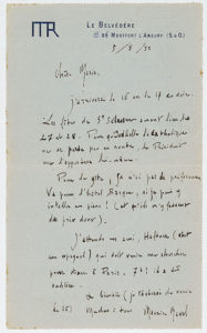 RAVEL Maurice (1875-1937). L.A.S. «Maurice Ravel», Montfort l'Amaury 5 août 1932, à son amie Mlle Marie GAUDIN à Saint-Jean-de-Luz ; 1 page in-8 à son monogramme MR et à en-tête Le Belvédère, adresse au dos. Il arrivera...