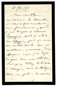 SAINT-SAËNS Camille (1835-1921). L.A.S. «C. Saint-Saëns», 18 septembre 1891, à «Mon cher Vieux» [Jules BARBIER] ; 2 pages et demie in-8 (deuil). Amusant refus d'un livret. «Le scénario de Marcellus est tout à fait...