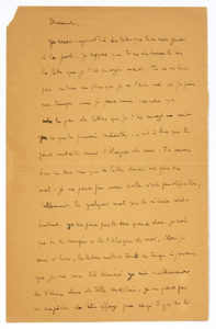 BATAILLE Georges (1897-1962). L.A.S. «Georges», Dimanche [1934, à Dora MAAR] ; 2 pages in-8 sur papier jaune. Douloureuse lettre d'amour, à la fin de sa liaison avec Dora Maar. Il a reçu sa lettre, et craint qu'elle ne veuille...