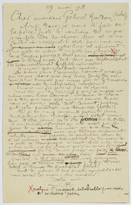 BLOY Léon (1846-1917). L.A.S. «LB» (minute avec ratures et corrections), 19 mai 1898, à Gabriel Randon (Jehan RICTUS) ; 1 page in-8. Il se justifie et exprime son grand étonnement, Rictus ayant été choqué par la dédicace...