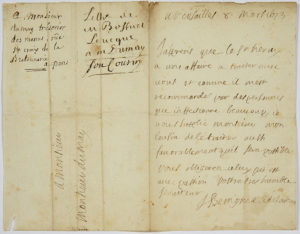 Maurice Dumay, trésorier des menus plaisirs. «J'apprens que le Sr Henry a une affaire a traiter avec vous et comme il m'est recommandé par des personnes que j'affectionne beaucoup, je vous supplie monsieur mon cousin de le traiter aussi favorablement qu'il sera possible»...