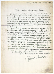 BRETON André (1896-1966). L.A.S. «André Breton», New York 29 mars 1944, à Mme REIS ; 1 page in-4 à l'encre verte. Il lui envoie une liste d'adresses pour l'envoi de la revue VVV, et la remercie, ainsi que son mari Bernard, pour leur...