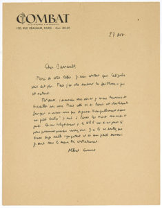 CAMUS Albert (1913-1960). L.A.S. «Albert Camus», 27 novembre [1946], à Jean-Louis BARRAULT ; 1 page in-4 à en-tête de Combat. Au sujet de Caligula. Il est «content que Caligula vous ait plu. Mais j'en vois surtout les faiblesses, ce...