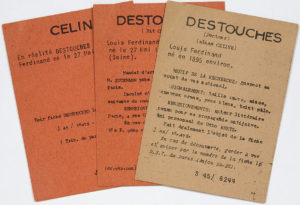 [CÉLINE Louis-Ferdinand (1894-1961)]. 3 fiches signalétiques imprimées, [1945] ; 11 x 8 cm. Fiches signalétiques de la Police des Frontières, concernant DESTOUCHES dit CÉLINE, à la suite du mandat d'arrêt du 19 avril 1945....