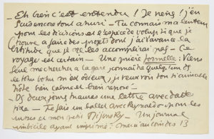 Russes, Le Dieu bleu [musique de Reynaldo HAHN, livret de Cocteau, créé le 13 mai 1912 au Châtelet]. «Eh bien c'est entendu ! Je viens ! J'en suis encore tout ahuri - Tu connais ma lenteur pour les décisions et l'espèce de volupté que je trouve à faire des projets dont j'ai d'avance la certitude que je ne les accomplirai pas. [...] Je fais un ballet avec Reynaldo pour les russes et mon petit NIJINSKI». Il cite un écho de «journal imbécile » : «Maman m'a fait une scène sous prétexte que je lassais l'opinion par mes excentricités (????????????) (très maman). [...] Fémina m'a demandé un sonnet pour leur superbe numéro Luxe sur “Le dîner en ville”, moi qui me jurais de ne plus jamais faire ce genre, voilà qu'on me l'accroche officiellement dans le dos»...