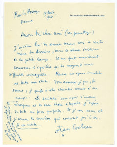 COCTEAU Jean (1889-1963). L.A.S. «Jean Cocteau», La Roche-Posay 19 août 1946, à un ami ; 1 page in-4. «J'ai vécu bien des années comme vous au centre même du désordre, dans le calme sublime de la petite lampe. Il me faut...