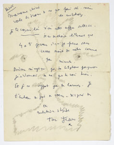 41455 COCTEAU Jean (1889-1963). L.A.S. «Ton Jean» avec DESSIN, Vendredi, à Marianne OSWALD ; 1 page in-4 (27 x 21 cm, marques de plis avec petite fente, un bord lég. effrangé). La lettre est écrite sur un grand dessin au crayon...