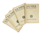 7 annate in 258 fascicoli in-folio e in-8°. Dal n. 1 anno II, del 16 dicembre 1909 al n. 2 dell'anno VIII del 29 febbraio 1916. Doppi i nn. 3, 19, 24, 26, 45 dell'Anno IV. Presenti anche gli Indici dell'anno 1910, 1911 e 1913 e 1 Bollettino Bibliografico dell'Anno III, 5 dell'Anno IV e 8 dell'Anno V. Mancanti i nn. 4, 5, 10, 19, 31 dell'Anno II; n. 3 dell'Anno III; n. 51 dell'Anno IV; nn. 1, 3, 4, 10, 11, 17 dell'Anno VI; nn. 10, 16 dell'Anno VII; nn. 3-12 dell'Anno VIII, oltre al n. 15 dell'Anno VII (mai pubblicato). Esemplare da studio, con molti difetti da controllare, non passibile di restituzione. SI AGGIUNGE: La Voce. Edizione politica. Firenze: Libreria della Voce, 1915. 14 fascicoli in 1 volume in-8° (mm 250x170). Tutto il pubblicato, dal n. 1 del 7 maggio 1915 al n. 14 del 31 dicembre 1915. SI AGGIUNGE: Almanacco della Voce 1915. Firenze: Libreria della Voce, 1915. (260) I OPERA: Una tra le più importanti riviste del '900, fondata nel 1908 da Giovanni Papini e Giuseppe Prezzolini, dopo il superamento della fase inquieta del Leonardo. La rivista, dapprima settimanale poi quindicinale, rivestì un ruolo centrale nel dibattito politico e culturale italiano, grazie anche al contributo di alcune tra le personalità più importanti di quel periodo (tra i quali De Robertis, Borgese, Campana, Cozzani, Croce, Folgore, Govoni, Palazzeschi, Saba, Sbarbaro, Serra, Soffici e tantissimi altri) che contribuirono a creare un dibattito intellettuale a carattere nazionale e di respiro europeo. Da tale esperienza scaturiranno filiazioni illustri, quali L'Unità e Lacerba, oltre ad una nutrita collana di opere realizzate con un proprio marchio editoriale.