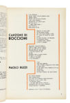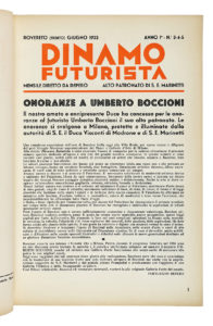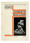In-4° (340x245). Carte [2]; pagine 20, [2] con 1 tavola su carta patinata con il fotoritratto di Boccioni e 7 tavole su carta patinata con le fotoriproduzioni di opere di Boccioni; il tutto in bianco e nero, fuori testo. Ottima copia. Brossura editoriale con punti metallici, con design dell'Artista a due colori al piatto e fotoriproduzione in bianco e nero di Muscoli in velocità di Boccioni applicata al piatto anteriore e bellissimo logo deperiano in arancione al piatto posteriore. Una piega all'angolo superiore del piatto, altrimenti ottima conservazione. Non presente il rarissimo pergamino originale semitrasparente a proteggere la copertina. (1) Ultima, rara uscita della rivista futurista diretta e graficamente curata da Fortunato Depero, realizzata in occasione delle solenni Onoranze Nazionali a Umberto Boccioni, promosse dal Comune di Milano (14–16 giugno 1933). Diversa per formato e impianto grafico rispetto ai numeri precedenti, questa edizione fu stampata in una tiratura ampliata per celebrare la figura dell'artista simbolo del Futurismo italiano. Straordinario oggetto d'arte e di propaganda, il numero si distingue per l'altissima qualità tipografica e visiva, con contributi inediti e vibranti di Marinetti, Buzzi, Russolo, Notari oltre a testi selezionati dalla stampa e memorabili citazioni tratte dagli scritti boccioniani. Due preziosi diagrammi disegnati da Depero, accompagnano una ricca selezione iconografica di opere di Boccioni, rendendo questo numero un vero omaggio visivo e teorico al genio dell'avanguardia.