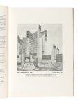 In-4° (mm 320x235). Buona copia, ampiamente fiorita, con moltissime riproduzioni fotografiche di edifici e tavole incise in rotocalco, la maggior parte delle quali a piena pagina nel testo. Cartonato editoriale con illustrazione futur-costruttivista in rosso e nero su fondo argento di Ugo Pozzo in rosso e nero su sfondo argento, con titoli al piatto. Lievi abrasioni e mancanze alle cerniere e tracce di polvere ai piatti. SI AGGIUNGE: Wright Lloyd Frank, Architettura e democrazia. Milano: Rosa e Ballo, 1945. (2) I OPERA: Edizione originale, rara e ricercata, di questa importante monografia sulle avanguardie architettoniche dei primi decenni del XX secolo, che riproduce le opere di Baldessarri, Depero, Fillia, Le Corbusier, Libera, Prampolini, Sottsass e molti altri, e gli scritti originali di Marinetti, Gropius, Diulgheroff, Ginsburger, Vedres, Lurcat, Von Der Muhll. II OPERA: Prima edizione italiana di quest'opera, impreziosita dal design e dall'impaginazione di Luigi Veronesi (non menzionato).