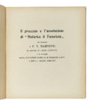 In-8° (mm 193x170). Ottimo esemplare. Brossura editoriale in cartonato rosso con titoli in nero ai piatti. Dorso restaurato, con minime perdite alle cuffie e macchie ai piatti; difetti e restauri al piatto anteriore e al dorso. (1) Edizione originale della traduzione italiana di questo poema, pubblicato in originale a Parigi nel 1904. Opera iconica, resa celebre dalla copertina rosso rivoluzionario, simbolo della rottura futurista, e dal formato inusuale e provocatorio, a mattonella, che ne fa un oggetto-libro carico di forza visiva e concettuale. Proprio recensendo questo volume sul Mercure de France (1° aprile 1911), Ricciotto Canudo coniò una delle definizioni più folgoranti dell'estetica marinettiana: «Les couvertures des éditions futuristes sont rouges, comme celles des brochures révolutionnaires. C'est un symbole et une indication. [...] Chaque volume qui sort des presses futuristes est un cri de révolte et un appel à la libération». Completa il volume, con propria paginazione, la cronaca del celebre processo a «Mafarka il futurista», vero spartiacque per la legittimazione del movimento. In appendice sono riportati il discorso difensivo di Marinetti, la perizia letteraria di Luigi Capuana e le arringhe degli avvocati Barzilai, Cappa e Sarfatti. Gambetti-Vezzosi 515; Cammarota, Marinetti 28.