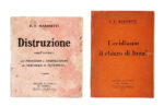 In-8° (mm 213x155). Pagine 23, [1]. Esemplare in barbe, con i margini esterni delle pagg. 1-4 e 23-24 ricostruiti. Brossura originale arancione con titoli impressi in nero al piatto anteriore. Dorso completamente ricostruito e piatti controfondati, con mancanza marginali reintegrate. SI AGGIUNGE: Id., Distruzione. Poema futurista. 1° migliaio. Milano: Edizioni futuriste di Poesia, 1911. Esemplare con difetti da controllare. (2) I OPERA: Terzo fondamentale manifesto futurista, redatto in italiano e francese nel luglio 1909 e pubblicato con altro titolo. Questo nostro opuscolo rappresenta la quarta edizione, la prima con il titolo definitivo e la più ricercata perché legata a una famosa scazzottata futurista, la rissa con i vociani del 22 giugno 1911; dopo essere stati arrestati, in guardina vociani e futuristi fraternizzano e Marinetti racconta che «Prezzolini benché sanguinante tentava ancora di mordere con ironia il mio manifesto Uccidiamo il chiaro di luna!». Si veda Cammarota, Marinetti 29; Cangiulo, Serate futuriste 17. II OPERA: Si veda lotto precedente.