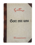 1 fascicolo di testo in-folio (mm 500x350) e 6 cartelle in-folio grande (mm 700x500) con titoli in rosso e nero al piatto, contenenti ciascuna 4 tavole di Renato Guttuso, 2 in bianco e nero e 2 a colori, per un totale di 24 serigrafie tutte firmate e numerate a matita dall'Artista, con timbro a secco in basso a sinistra. Difetti alle veline e rare fioriture marginali alle tavole. Fioriture nel fascicolo di testo. Cartella editoriale in mezza pelle, con punte e titoli in rosso e nero al piatto anteriore. Abrasioni ai piatti e dorso completamente staccato, ma presente. Tiratura in 100 esemplari numerati. (7) Potente manifesto grafico contro ogni forma di sopraffazione, Gott Mit Uns è un'opera di grande forza politica e formale. Il ciclo nasce dal recupero e dalla rielaborazione di un nucleo di disegni eseguiti da Guttuso durante la Resistenza, originariamente stampati con mezzi tipografici rudimentali e oggi in gran parte perduti. Il titolo – che riprende il motto inciso sulle fibbie dei soldati tedeschi – diventa per l'artista un emblema rovesciato, carico di denuncia. Con segno energico e impianto espressivo drammatico, Guttuso restituisce una narrazione visiva degli orrori della guerra e dell'occupazione nazista, mescolando episodi biografici e immagini collettive di dolore e ribellione. L'opera, con le sue figure tormentate e icastiche, i volti scavati e i corpi contratti dalla violenza, diventa un simbolo della memoria partigiana italiana, una delle opere più commoventi che celebrano il 25 aprile, nonché una delle vette della produzione grafica di Guttuso, tra i maggiori interpreti dell'impegno civile nel secondo dopoguerra italiano.