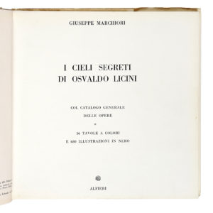 In-8° (mm 226x240). Esemplare profusamente illustrato, con le riproduzioni in bianco e nero e a colori, anche a piena pagina, delle opere di Osvaldo Licini. Legatura editoriale in mezza tela, con la riproduzione della firma dell'artista al piatto anteriore; sovraccoperta illustrata con titoli in nero al dorso. Una mancanza reintegrata con perdite di testo alla cuffia superiore e piccoli strappi marginali alla sovraccoperta, per il resto buona copia. (1) Importante catalogo generale delle opere di Osvaldo Licini.
