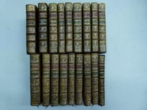 Neaulme et Compagnie, 1742-1753 ; 18 vol. in-12, veau marbré, dos à nerfs ornés de motifs dorés, pièces de titre rouges et de tomaison bronze, [Rel. de l'époque]. Frontispice gravé sur cuivre d'après Boucher. Une troisième partie, intitulée Histoire du peuple de Dieu, ou paraphrase des Epitres des Apötres (2 vol.), parut à Lyon en 1757. Ex-libris héraldique gravé. Bel ensemble, bien complet des deux premières parties, en reliures en veau de l'époque.