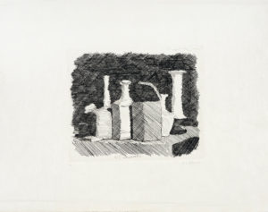 In-folio (mm 480x170). Pagine 148, [4]. Con 50 tavole applicate a colori, sciolte e numerate, tutte protette da veline. Esemplare da una Bruniture alle veline, altrimenti esemplare perfettamente conservato. Brossura editoriale con titolo al piatto e velina protettiva; entro cofanetto in piena pelle, con titoli in nero al piatto anteriore e al dorso. Minime spellature, ma nel complesso ottima copia. Esemplare A, impreziosito da una splendida acquaforte in barbe di Giorgio Morandi (Foglio: mm 370x476; inciso: mm 200x240), siglata A a matita in basso a sinistra e firmata A. D. MT Morandi (Anna, Dina e Maria Teresa Morandi, le sorelle dell'Artista) in basso a destra. Piegature al margine inferiore e superiore, altrimenti ottima conservazione. Opera accompagnata da una certificazione manoscritta da Pietro Lenzini, membro del Comitato di Giorgio Morandi, firmata e datata Firenze, 10 maggio 2023, che attesta che si tratta di un'acquaforte «[...] su lastra di rame, firmata e datata dal Maestro (al centro con data 1930), registrata col n. 124 nel volume L'opera grafica di Giorgio Morandi a cura di Lamberto Vitali. La lastra è stata ritrovata dopo la morte dell'artista e la tiratura è stata curata dallo stesso Vitali e le copie, stampate al torchio di Giorgio Upiglio, controfirmate e numerate dalle sorelle nel 1973 in occasione della realizzazione dell'opera 50 acquerelli di Giorgio Morandi, editato da ILTE. L'opera siglata A, appartiene a M. Teresa Morandi.». (2)