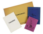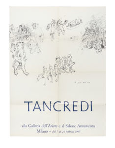 Compongono il lotto: 1) Parmeggiani Tancredi, Sedici Studi. Editore: Edizioni del Naviglio, Milano, 1968; 2) Disegni di Tancredi. Milano: All'insegna del Pesce d'oro, 1983; 3) Tancredi, 1952-1962. Milano: Galleria Dell'Ariete, 1964; 4) Tancredi. Tempere su carta. Brescia: Galleria Centro, 1974; 5) 1 poster (mm 610x450) della mostra di Tancredi tenutasi alla Galleria dell'Ariete di Milano dal 7 al 24 febbraio 1967. (5) Tancredi Parmeggiani (Feltre, 1927 – Roma, 1964), conosciuto semplicemente come Tancredi, è stato un artista italiano tra i più originali e intensi del secondo dopoguerra. La sua carriera, breve ma straordinariamente intensa, si svolge all'incrocio tra l'informale europeo, l'astrattismo lirico e l'avanguardia internazionale, con un linguaggio che ha saputo coniugare energia espressiva e raffinatezza cromatica. Tancredi è considerato oggi una figura chiave dell'arte informale italiana, per la sua capacità di rielaborare i linguaggi internazionali in una forma autonoma, lirica e profondamente personale. III OPERA: Catalogo pubblicato in occasione della mostra tenutasi alla Galleria Dell'Ariete di Milano, inaugurata il 7 febbraio 1964. IV OPERA: Poster della mostra di Tancredi alla Galleria dell'Ariete e al Salone Annunciata di Milano dal 7 al 24 settembre 1967.