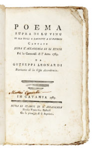Leonardi Giuseppe, Poema supra di lu vinu si sia utili o dannusu a li viventi... In Catania: ntra li stampi di l'Accademia pressu Franciscu Pasturi, 1789.