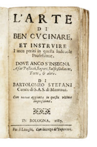 Stefani Bartolomeo, L'arte di ben cucinare [...] Dove anco s'insegna a far pasticci, sapori, salse, gelatine, torte... In Bologna: per il Longhi, 1687.