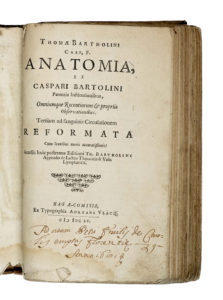 Bartholin Thomas, Anatomia, ex Caspari Bartolini Parentis Institutionibus... Tertium ad sanguinis Circulationem Reformata... Hagae Comitis: Ex Typographia Adriani Vlacq, 1655.