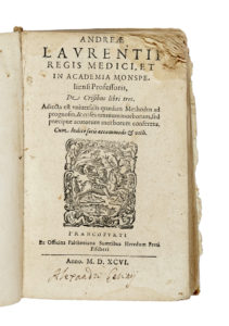 Du Laurens André, De crisibus libri tres. Adiecta est vniuersalis quaedam Methodus ad prognosin... Francofurti: ex officina Paltheniana sumtibus heredum Petri Fischeri, 1596.
