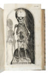 3 parti in due volumi in-folio (mm 410x265). Pagine: [20], 434, III-LXIV tavole; [4], 452, LXV-CV tavole e un ritratto dell'autore; [12], XVI, 34, [10], con XXI carte di tavola; tra la prima e la seconda parte V tavole aggiuntive numerate, nel complesso 135 carte di tavola. Nella prima parte assenti le tavole I, II e ripetute le carte K2, K5. Nella seconda parte assenti le carte K2, K5. Ciascuna parte con proprio frontespizio e vignetta calcografica, occhietto al primo volume, frontespizi della prima e ultima parte stampati in rosso e nero. Dedica manoscritta al frontespizio della prima parte. Volumi leggermente uniformemente bruniti con qualche leggera fioritura, gore al margine superiore, macchioline sparse e altri minimi segni del tempo. Al primo volume da p. 261 a p. 302 lavorino di tarlo con trascurabili perdite di qualche lettera, anche la terza parte con lavorini di tarlo e minime perdite di testo. Le carte di tavola in fresca impressione, un disegno osceno ad una di queste, qualcuna con qualche gora e qualche tavola della terza parte con restauri e lavori di tarlo con perdite. Nel complesso comunque una buona copia con belle tavole. Mezza pergamena posteriore con punte e titoli manoscritti al dorso, piatti in cartonato decorato. (2) Prima edizione di questa raccolta che presenta le più recenti scoperte del tempo in campo anatomico; l'osteologia è attribuita a Bidloo, la miologia a Brown e l'asplancnologia a Ruysch. La collazione delle tavole delle prime due parti è riportata dalla tabella presente in testa al secondo volume. Graesse IV, 363.- Brunet III, 1365 (per l'edizione del 1717).