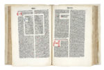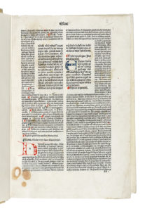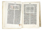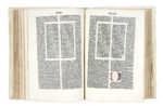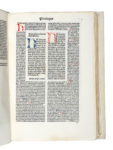 In folio (mm 317 x 218). Carte: [334 (di 350)]. Collazione: AA9, BB-GG10, HH12, JJ-KK10, LL9, MM10, NN12, OO8, PP-XX10, YY-BBB8, CCC12, DDD-EEE10, FFF-HHH8, JJJ10, Aa7, Cc10, Dd9. Copia scompleta di 16 carte, con le carte QQ1 e QQ10 leggerissimamente più corte, con qualche restauro e con altri minori difetti, ma stampata su bella carta e con numerosissime iniziali in rosso e in blu. Pergamena moderna. (1) Parte della Bibbia commentata da Niccolò di Lira (ca. 1270-1349), francescano e teologo francese. Consegui il dottorato in teologia alla Sorbona attorno al 1309 e si dedicò per quasi quarant'anni ai suoi commenti alla Bibbia. Edizione impressa a Venezia da Johannes Herbort di Seligenstadt, che iniziò la sua carriera veneziana come tipografo presso Johannes de Colonia et Nicolaus Jenson. L'editio princeps delle Postillae litteralis di Lira fu stampata da Conrad Sweynheym e Arnold Pannartz a Roma nel 1471-1472. Questa è la prima edizione con il commento di Niccolò di Lira a corredo del testo (cfr. https://ourheritage.ac.nz/items/show/6336). ISTC ib00611000; Goff B611; HC 3164*; IGI 1683; BMC V 301; GW 4286.