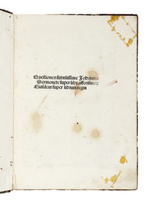 In-folio (mm 304x214). Carte: 73, [1]. Testo in gotico su due colonne, iniziali xilografiche, grande marca di Scoto in fine. Frontespizio con qualche macchia, altre minori macchiette marginali, cerniera anteriore un po' sciolta, ma nel complesso buona copia completa e genuina in mezza pelle posteriore (mancanze al dorso molto fragile, abrasioni e altri difetti). (1) Le Questiones subtilissime di Giovanni Sermoneta (alias "Johannes Sermoneta") sono un insieme di domande e risposte tecniche in merito agli Aphorismi di Ippocrate e al Tegni di Galeno. Ebbero parecchia diffusione tra studiosi di medicina e filosofia nel tardo Quattrocento. Giovanni Sermoneta fu un medico e docente senese del XV secolo. Insegnò medicina a Bologna, Firenze e poi a Siena, dove esercitò anche come medico pratico per importanti personalità, tra cui Federico da Montefeltro. Lavorò all'ospedale di Santa Maria della Scala e fu attivo fino al 1444. ISTC is00475000; Goff S475; H 14701*; IGI 8939; BMC V 450; GW M14732.